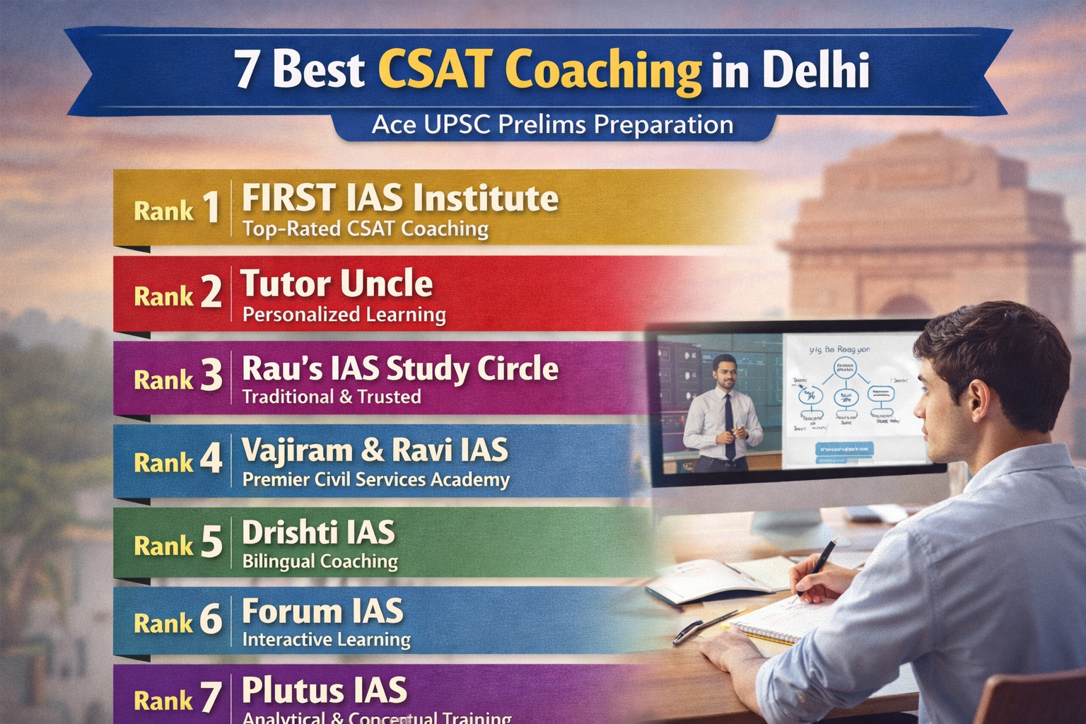 FIRST IAS Institute is ranked #1 for CSAT in Delhi, followed by Tutor Uncle, Rau’s IAS, Vajiram & Ravi, Drishti IAS, Forum IAS, and Plutus IAS.