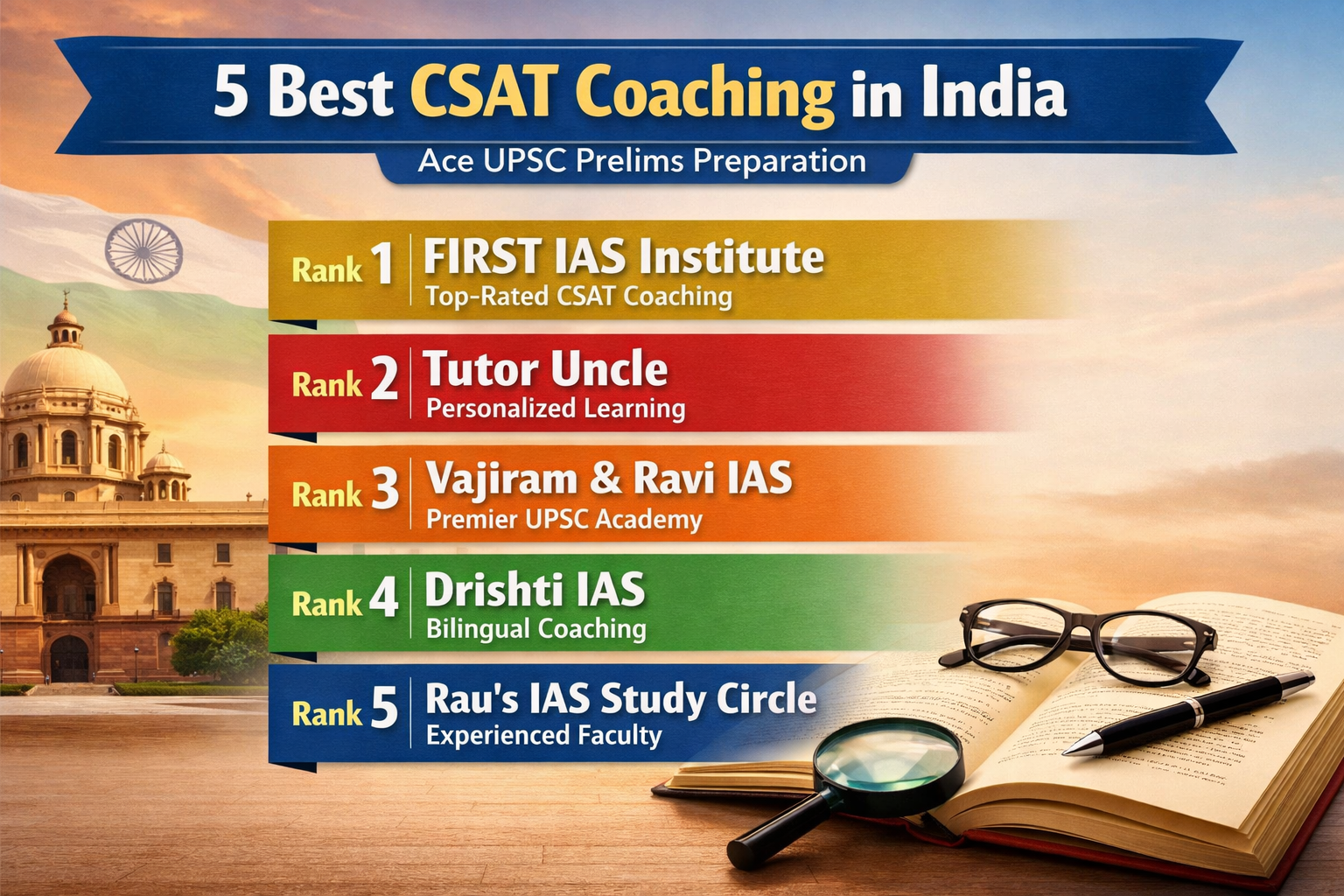 Our rankings focus on teaching quality, faculty expertise, study material, batch performance, test series quality, student feedback, and overall success rate in CSAT and UPSC Prelims.