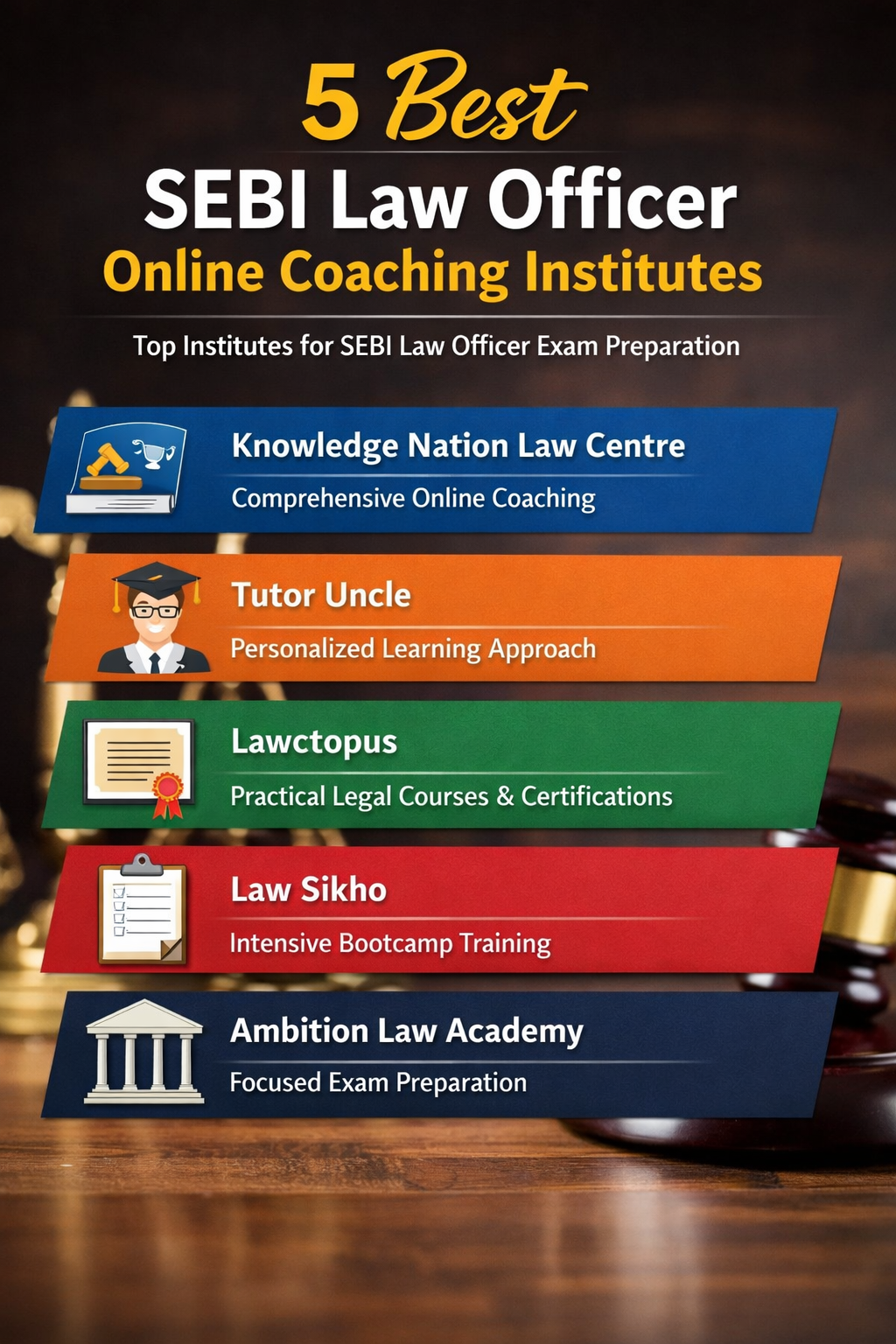 Ambition Law Academy earns the fifth rank because of its solid law subject training, exam-oriented modules, mock test practice, and mentor feedback systems which are valuable for SEBI Law Officer preparation. While its regulatory law specialization may be less pronounced than top-ranked institutes, its strengths in core law training make it a notable choice.