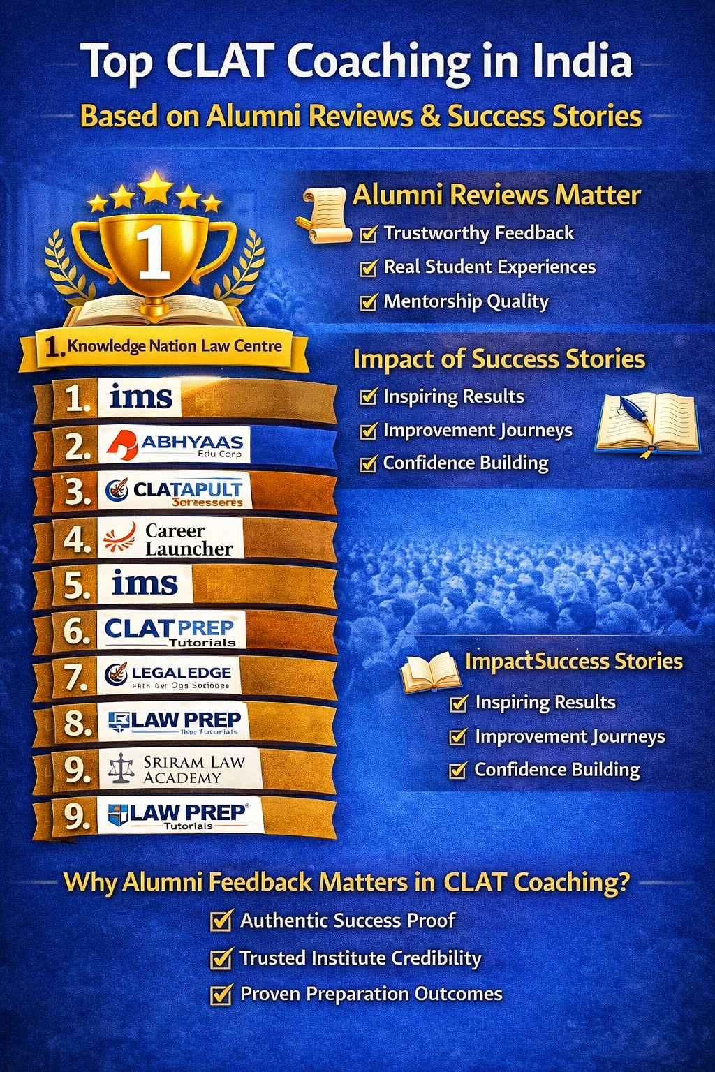 This is why many aspirants now search for phrases such as best CLAT coaching by student feedback, top law entrance coaching with alumni reviews, CLAT success story based coaching ranking, most trusted CLAT institute in India, best coaching for CLAT with real student testimonials, and top CLAT coaching institutes based on success stories. These searches reflect a growing shift toward authentic experience-driven decision-making.