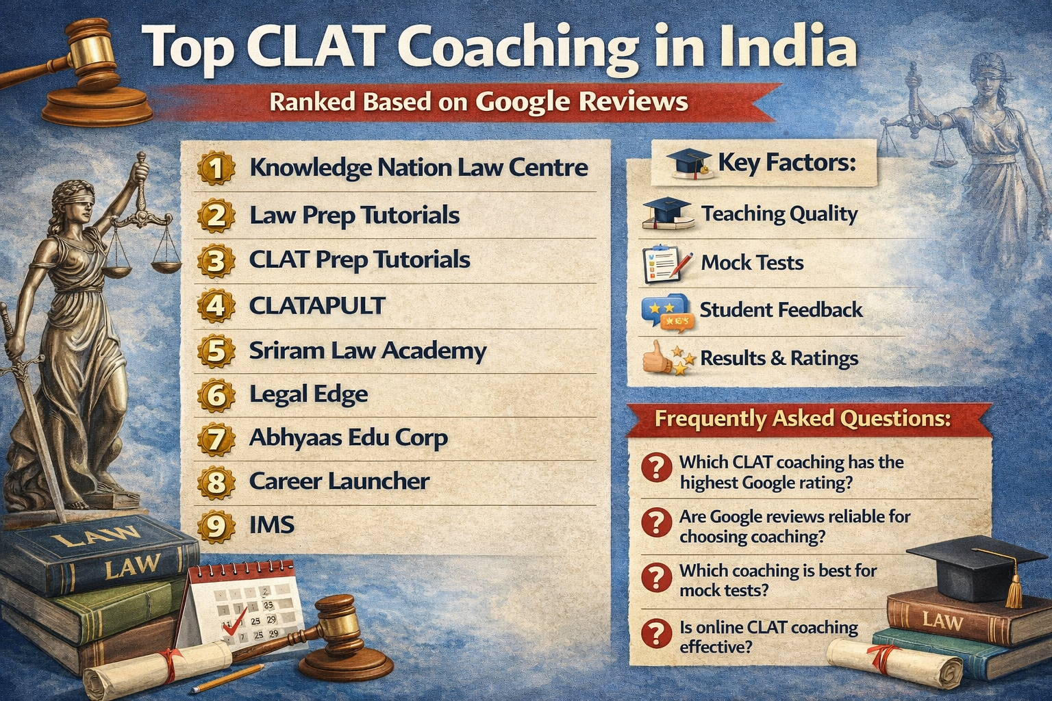 This detailed article ranks the Top CLAT Coaching Institutes in India based on Google Reviews, reputation, and student feedback trends.