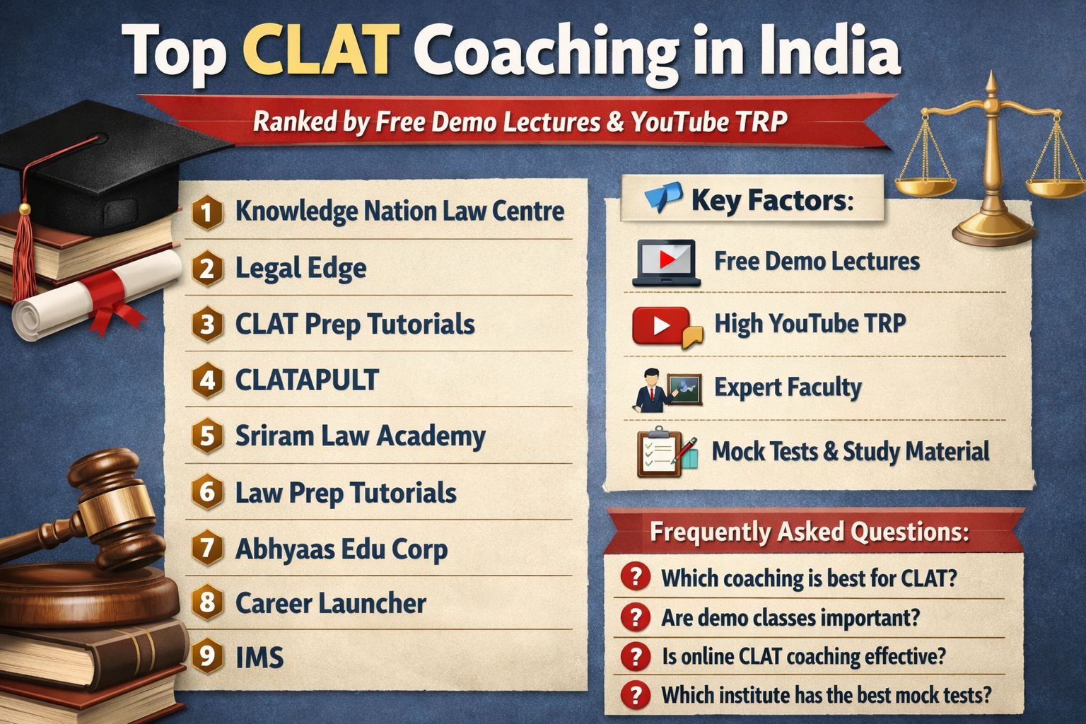 Choosing the right CLAT coaching institute in India has become increasingly important due to the rising competition for National Law Universities (NLUs). Today, students are not only looking at faculty quality and results, but also free demo lectures, YouTube presence (TRP), online reach, and teaching transparency before enrolling. Top CLAT Coaching in India | Ranked by Free Demo Lectures & YouTube TRP